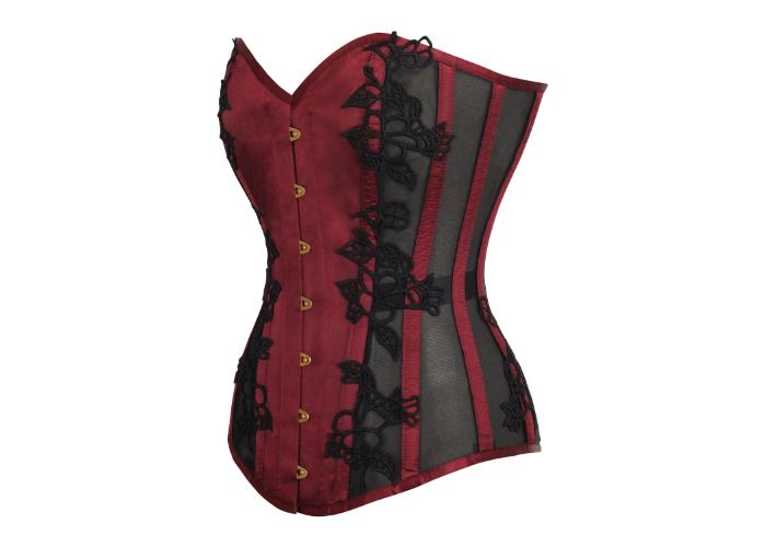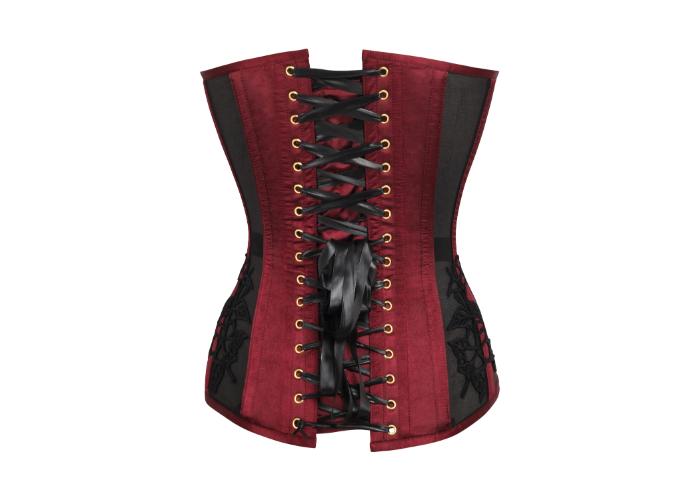 - Burgundy longline overbust corset, ribbon lacing corset, mesh panels corset, steel busk corset, criss cross lacing, modesty panel corset, waist tape corset, suspender loops corset, 3-4 inch waist reduction, polyester corset, lightweight spiral steel bones, lightweight flat steel bones, vintage corset style, gothic fashion corset, steampunk corset, waist taming corset.