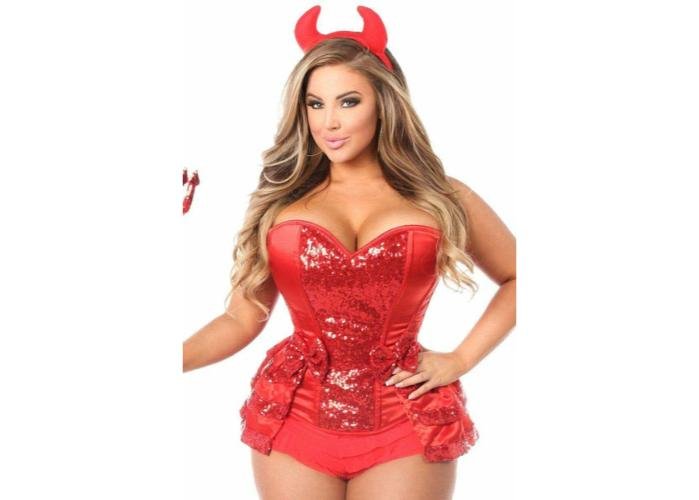 | Set Components | Full-bust corset, skirt, mesh ruffle panty, sequin pitchfork, devil horns | Complete ensemble for instant devilish impact |