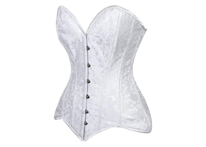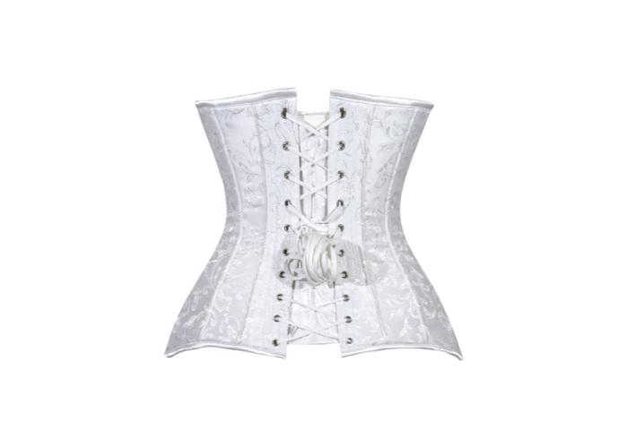Picture a garment that feels like a whisper of the past, yet bold enough to command attention in the present. The Lavish White Brocade Overbust Corset is crafted from sumptuous white brocade, a fabric that shimmers with intricate patterns, offering a luxurious texture that’s both durable and dazzling. Its pristine white hue makes it a standout for bridal corset elegance, evoking the purity of wedding days, while its subtle sheen adds a touch of opulence perfect for gothic fashion trends or steampunk-inspired looks. The front busk closure, featuring sturdy nickel brass clasps, provides a secure and elegant entry point, blending vintage charm with ease of wear.